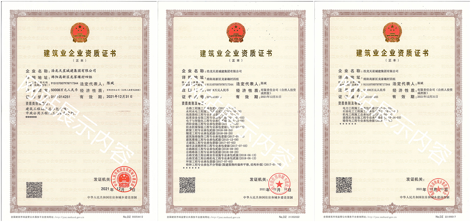 浩龍?zhí)煨浅墙瘓F(tuán)有限公司,2007年成立于“李白故鄉(xiāng)、中國(guó)科技城”—四川省綿陽(yáng)市,企業(yè)注冊(cè)資本金5.0008億元。公司共有27項(xiàng)建筑業(yè)企業(yè)資質(zhì),其中國(guó)家一級(jí)資質(zhì)11項(xiàng),二級(jí)資質(zhì)10項(xiàng),三級(jí)資質(zhì)5項(xiàng),特種資質(zhì)不分等級(jí)1項(xiàng),類(lèi)別涵蓋建筑、市政、水利、機(jī)電、隧道、起重設(shè)備安裝等基礎(chǔ)及未來(lái)發(fā)展重點(diǎn)專(zhuān)業(yè)。公司下設(shè)三個(gè)辦事處,業(yè)務(wù)范圍輻射全國(guó),在建項(xiàng)目三十余個(gè),累計(jì)完成產(chǎn)值超11億元。公司是綿陽(yáng)市建筑施工企業(yè)協(xié)會(huì)副會(huì)長(zhǎng)單位、綿陽(yáng)遂寧商會(huì)會(huì)長(zhǎng)級(jí)單位、綿陽(yáng)首批建筑業(yè)綠卡企業(yè),在綿陽(yáng)本地企業(yè)中綜合實(shí)力名列前茅。